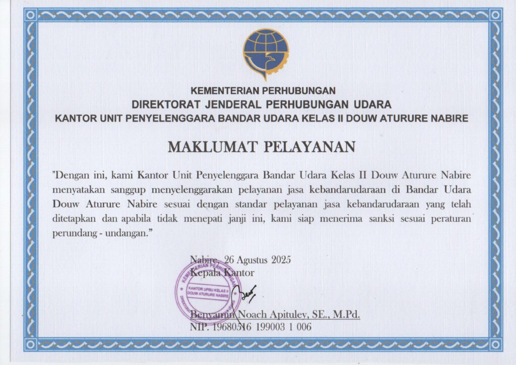Struktur organisasi Unit Penyelenggara Bandar Udara (UPBU) Kelas II Douw Aturure – Nabire dibentuk untuk mendukung kelancaran operasional bandara serta memastikan pelayanan terbaik bagi masyarakat dan pengguna jasa transportasi udara. Organisasi ini dipimpin oleh: